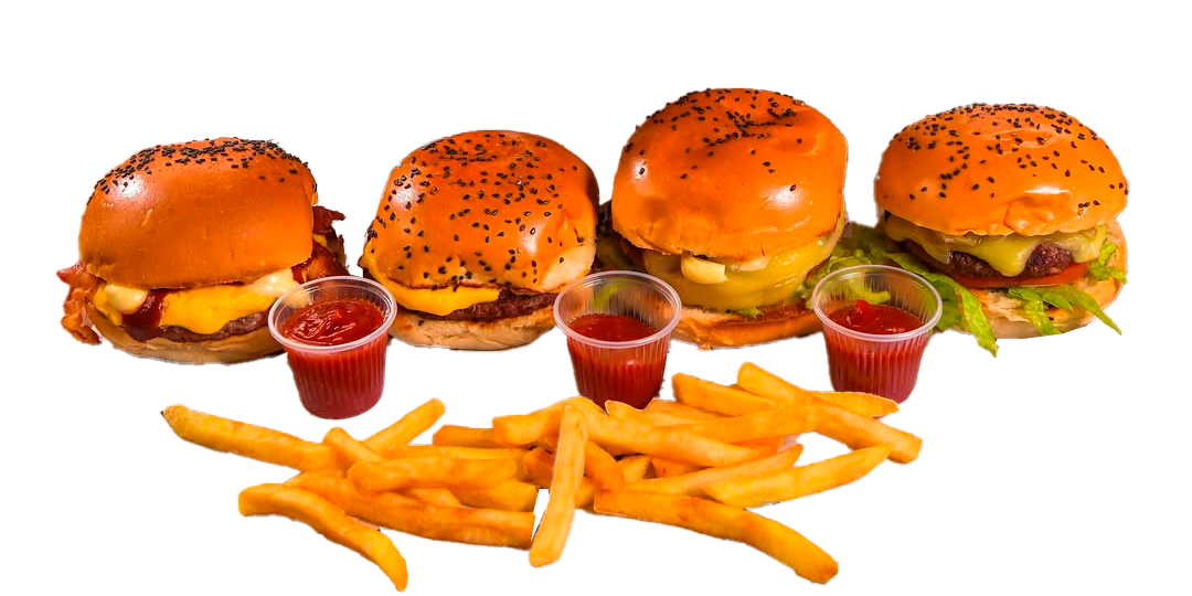 4 hamburguesas completas + 4 porciónes de papas fritas