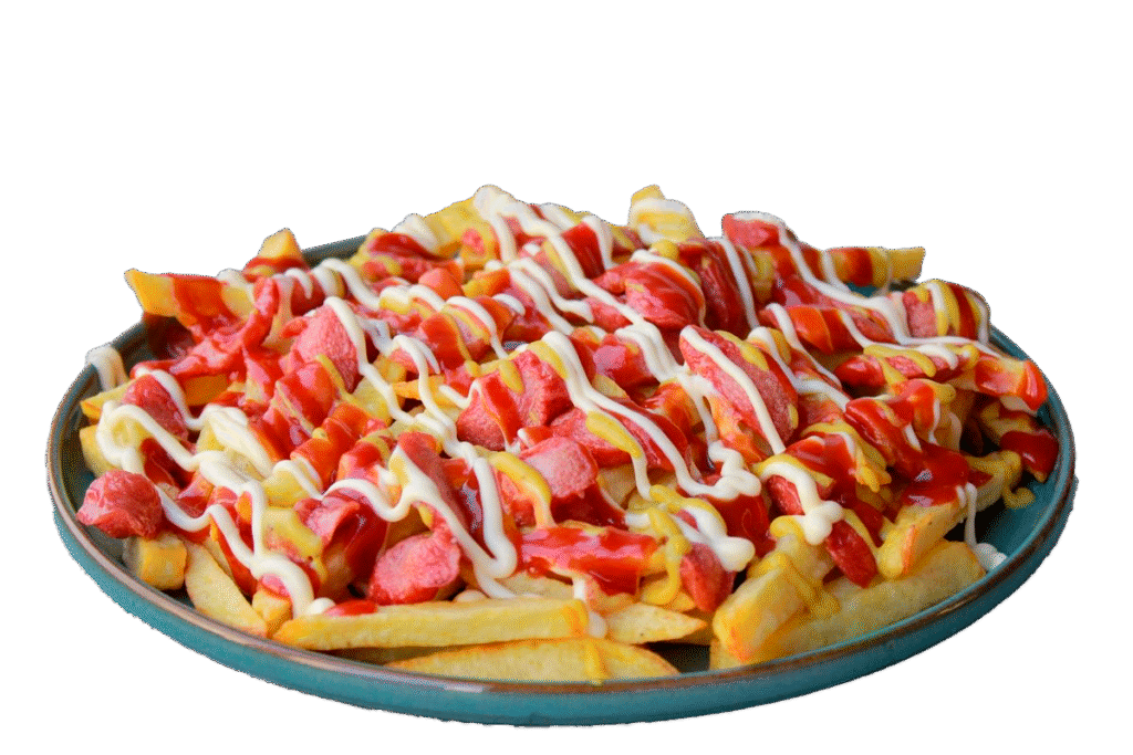 Papas fritas con salchichas y salsas