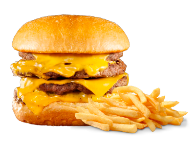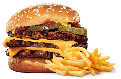 Hamburguesa con 3 carnes, queso cheddar y bacon + 1 porción de papas fritas
